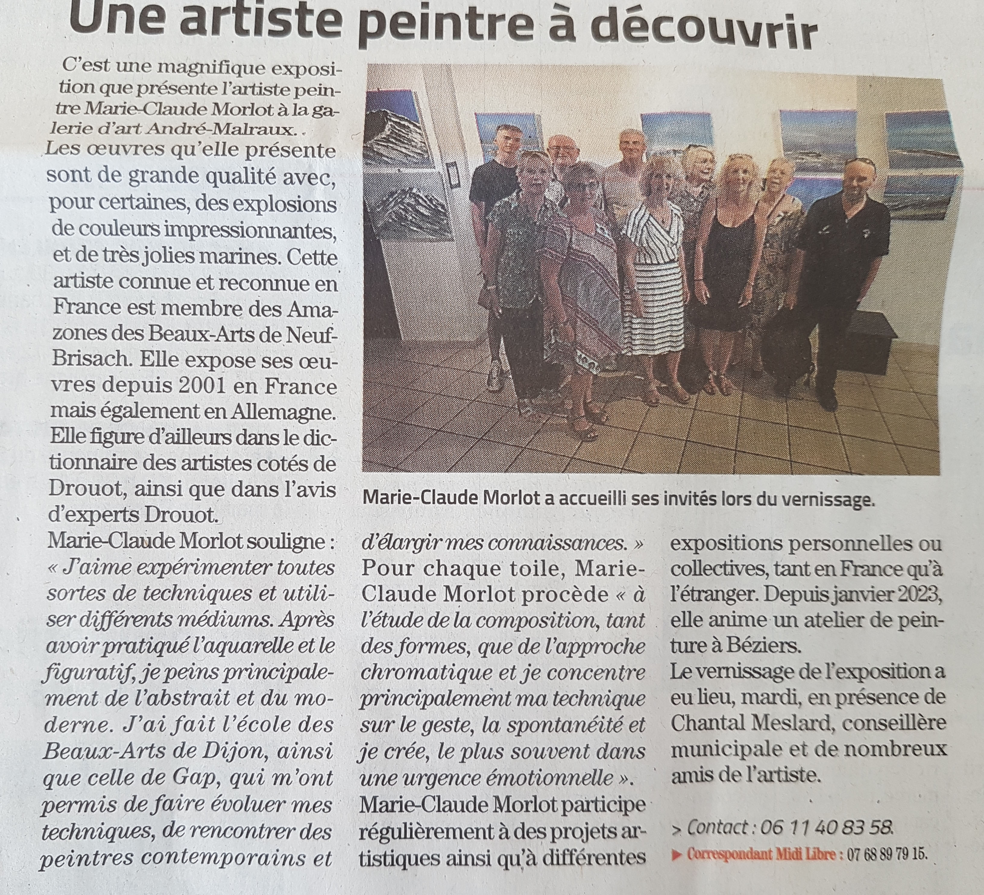 - Galerie d’Art André Malraux, Place du 14 juillet 34 450 VIAS du 17 au 27 juillet 2023.